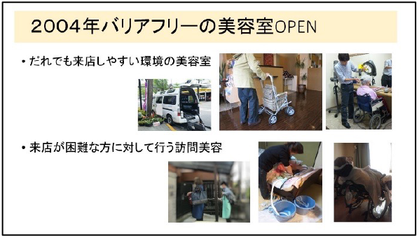 私は美容室に勤務しているときに美容福祉と出会い、将来に於いてその必要性を強く感じ2004年にバリアフリーの美容室として駅からは離れた住宅街と幹線道路に面した現在の場所を選び独立しました。
