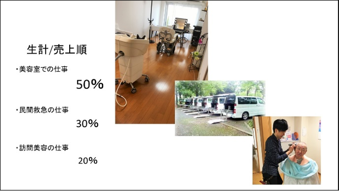 自分のお店も持っていてサロンワークもしていますが、外で民間救急の仕事もしています。訪問美容の仕事の割り合いが一番少ない状況です。まだまだ顧客が少ない状況です。