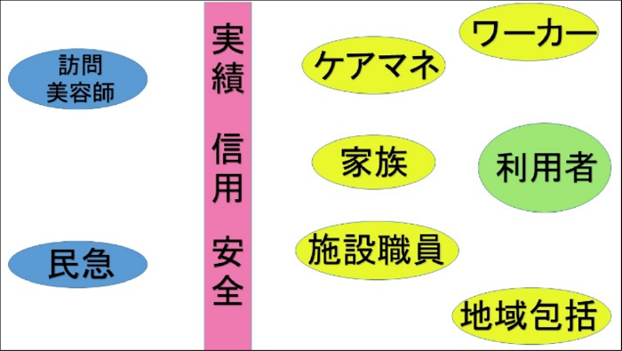 利用者の周りには、家族、ワーカー、ケアマネ、施設・チラシ、ポスティング