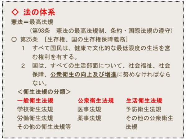 公衆衛生の向上及び増進に係る衛生法規体系で、理容師・美容師法は生活衛生法規に分類されています。