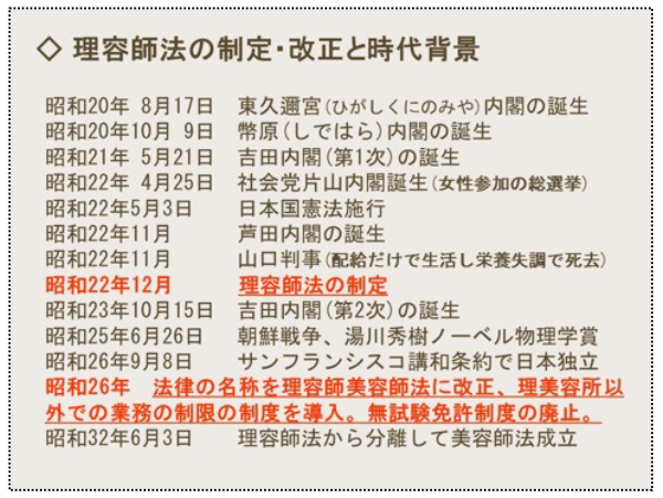 理容師法は戦後の政治・経済が混沌としていた昭和22年12月に制定され、同23年1月に施行されました。昭和26年には、法律の名称を「理容師美容師法」に改正、理美容所以外での業務の制限の制度を導入、無試験制度が廃止されました。