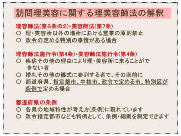 訪問理美容は原則禁止ですが、例外を認めています。その法的位置づけは上記の通りです。高齢化が進む現状では、理容師法・美容師法を改正すべきですが、現時点では例外規定になっていますので、これを遵守することが大切です。