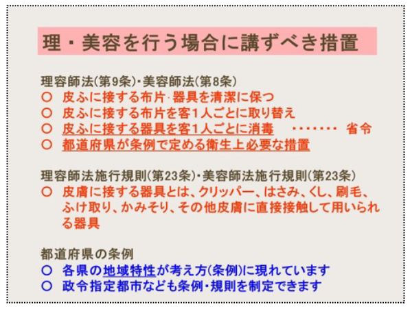 理美容師法は言うまでもなく衛生法規ですから施術の際に講ずべき必要な措置について法律では、下記のように、〇皮ふに接する布片・器具を清潔に保つ、〇皮ふに接する布片を客1人ごとに取り替え、〇皮ふに接する器具を客1人ごとに消毒、〇都道府県などが条例で定める衛生上必要な措置を講ずるとしています。