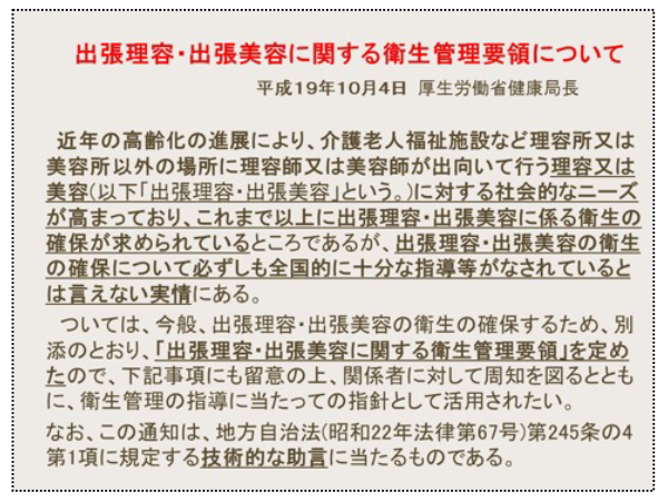 平成19年10月、に厚労省は下記の「出張理容・出張美容に関する衛生管理要領について」を都道府県知事等へ通知しました。