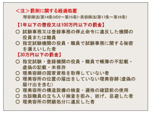 なお、今回の法制定は、さしあたり、美容業及び理容業についてそれぞれ個別の法体系を確立することに主眼が置かれた関係からして、次に掲げる部分を除き、原則的には旧法に規定する制度内容が踏襲され、従って美容業及び理容業両者の制度内容を対比した場合、その大綱については差異がないものであることとなっています。