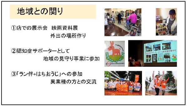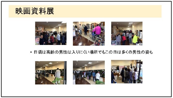 毎回テーマを決めて展示内容を変えていますが、特に時代劇のポスター展示には男性の高齢者が多く見受けられ男性高齢者の趣味を知る参考になりました。その他にも映画関係の仕事をしていた方など、開催を楽しみに毎年顔を出してくださる方も増えましたが、一昨年から映画資料を提供してくださっていた方のご都合で、花の写真や当店の活動などを紹介した写真展を開催していますが、やはり花が好きな方々が集まり、花情報の交換をしたりしながら、次回の散策コースを思い描いているようで介護予防にもつながります。また花の写真は花を見るために山歩きをしている方からお借りしたのですが、その表情は前出された映画資料の男性と同じくとても生き生きとされていました。高齢者の好みを知るにはその方々が過ごしてきた時代背景を知ることが大切だと気付かされました。