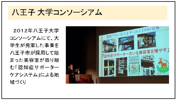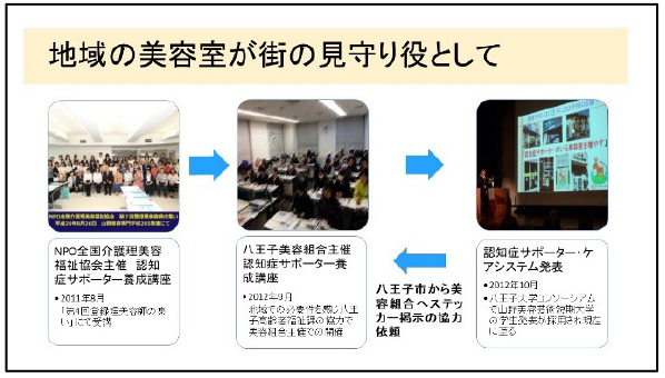 これは2011年8月に行われた「第4回登録理美容師の集い」で初めて受講した認知症サポーター養成講座がきっかけとなりました。受講後これは私の地域でも必要な事だと思い、翌年2012年9月に八王子市高齢者福祉課と八王子美容組合に協力していただき、八王子美容組合主催での「第1回認知症サポーター養成講座」を開催し、同じタイミングの翌月2012年10月に開催された「八王子大学コンソーシアム」での、山野美容芸術短期大学の学生が発表した「認知症サポーターケアシステム」が採用され、八王子市では前の月に組合が行った認知症サポーター養成講座の実績から、八王子美容組合に対してその協力要請があり、その後、産学官一体となっての事業として現在39店舗の美容室で「認知症サポーターがいます」のステッカーが掲示されています。
