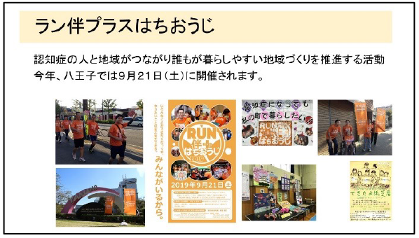これは全国規模で開催されている「ラン伴」の八王子バージョンです。これは認知症の人と一緒にタスキを繋ぐ体験を通じて、認知症の人と地域がつながり誰もが暮らしやすい地域づくりを推進する活動で、第3回目から参加しています。