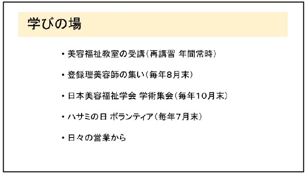 そのように何かしらの疾患や障がいのある方がサロンにご来店したり、訪問美容の依頼が増加することはリスクマネジメントの必要性も高まるためスタッフの教育も重要になります。今日の「集い」を含め、「学術集会」や「美容福祉公開講座の再受講」などで知識や技術を高め、現場ではお客様やご家族、または介助者の方に細かい注意点などを伺いながら施術しています。