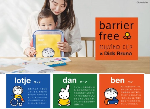 これはディック・ブルーナさんのデザインです。車イスにのっている「ロッテ」、人とちがった兎のたれ耳の「ダーン」、耳が不自由な「ベン」などです。それぞれは多様性を尊重するお話です。そして 「便利、楽しい、おしゃれに、キュートに」のさまざまなグッズを制作しています。そして相手の気持ちになってみようという「こころのボーダーをなくそう」がコンセプトになっています
